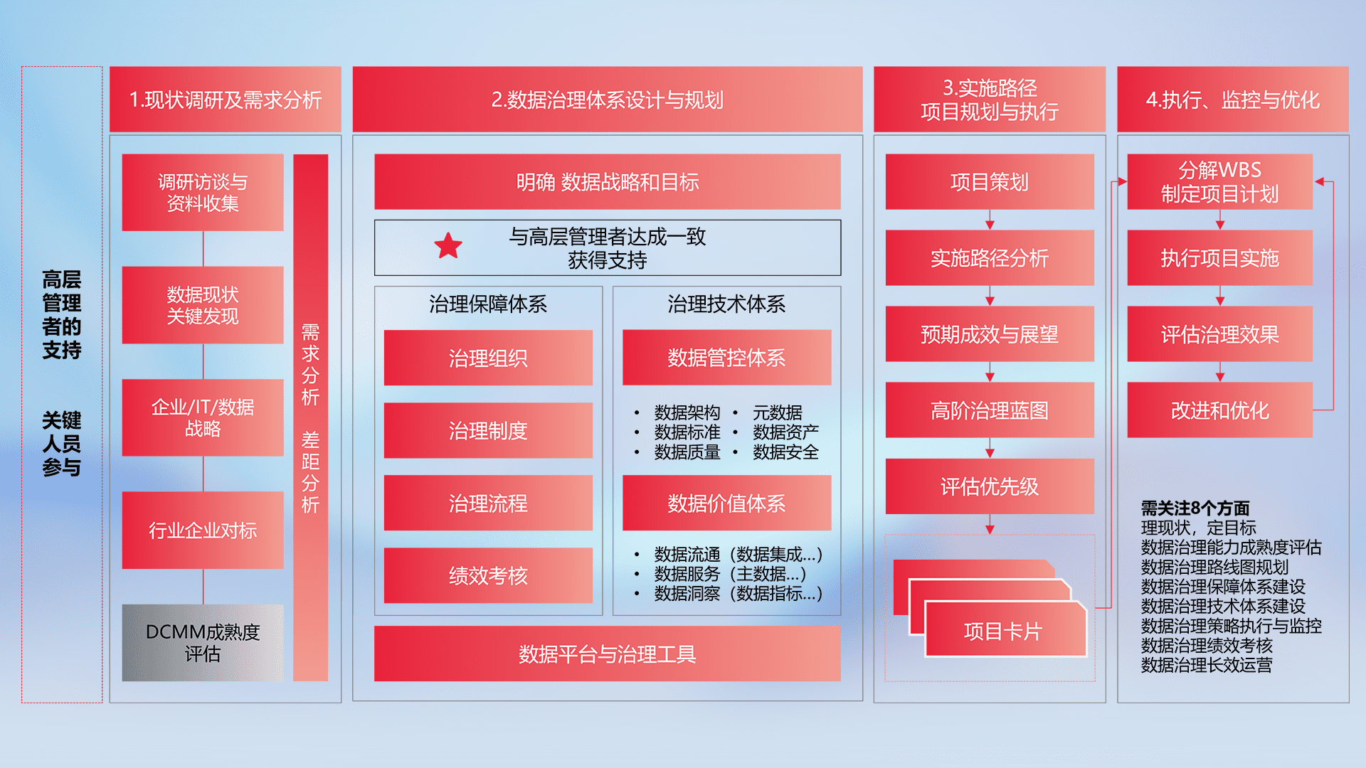 制定并执行统一的数据标准,规范数据定义和格式,消除冗余和不一致性,实现跨部门和跨系统的数据一致性,为企业提供标准化的数据基础。